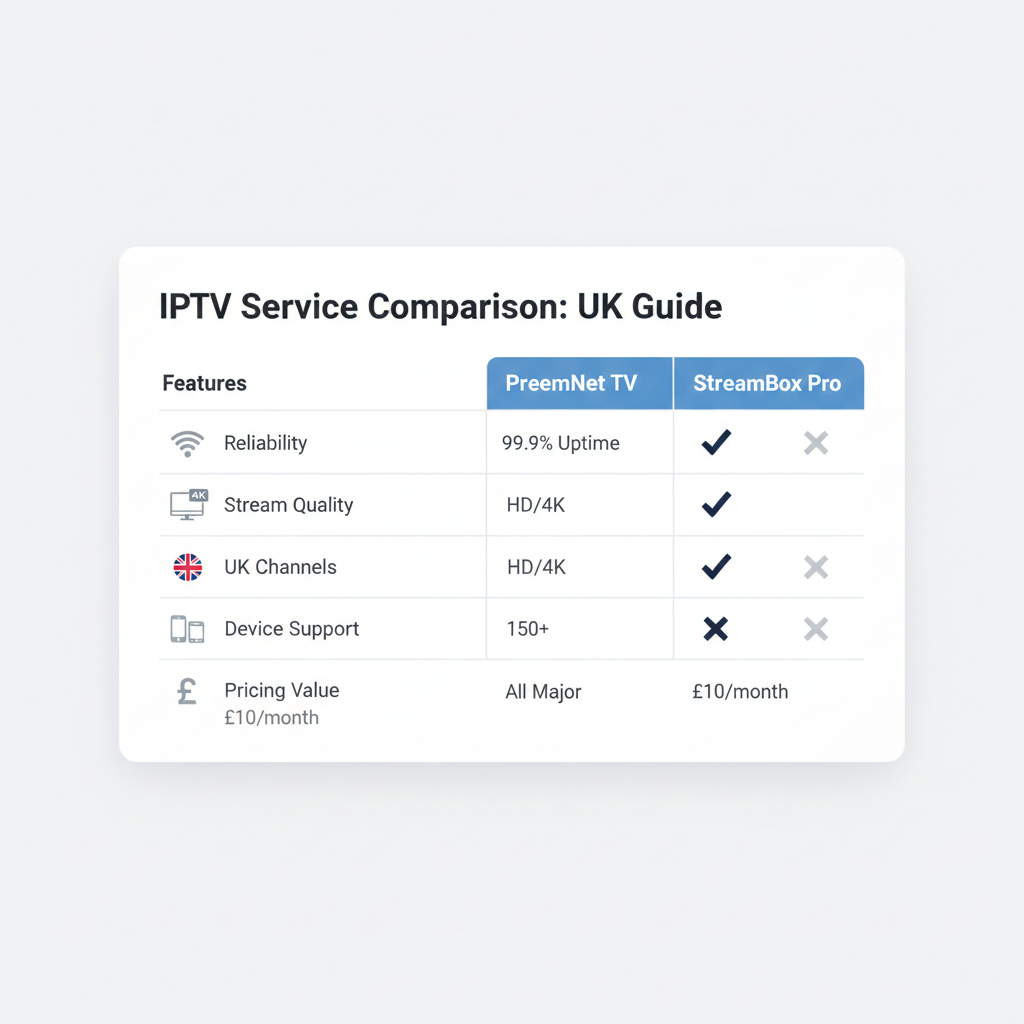 IPTV services sit in the flexible middle. They allow users to watch live TV across devices, often with added features like catch-up, VOD, and a modern app interface. The trade-off is that IPTV depends on both the provider’s stability and your home internet quality. This is why premium IPTV providers focus on reliability during peak evening hours and clean UK channel organisation. The comparison visual above highlights these differences clearly, helping you choose based on how you watch rather than just what’s cheapest.