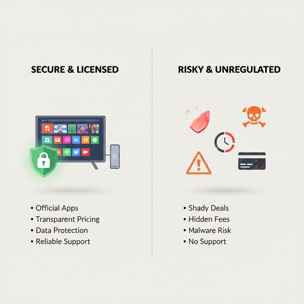 If you’re unsure, focus on red flags rather than marketing claims. Warning signs can include: constant domain changes, no visible company information, payment methods that feel unsafe, or services that disappear overnight. The legal risk is usually higher for providers than for viewers, but users still face practical risks such as service shutdowns, data exposure, or losing access without notice. The comparison visual above highlights the difference between licensed-style setups and risky offers — it’s a helpful mental checklist when deciding whether to start an IPTV subscription UK viewers can rely on.